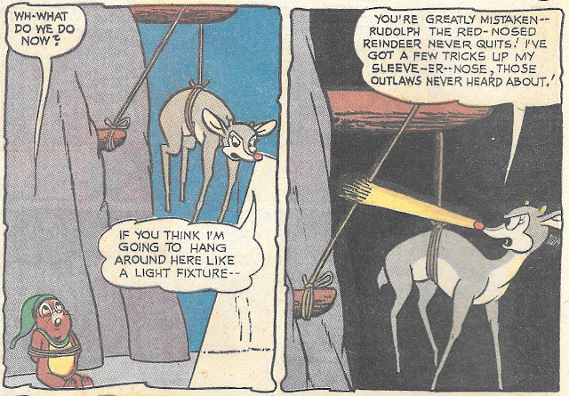 Having had their daily dose of fun, the outlaws take off to rob a few more ranches. Meanwhile, Rudolph decides that he's had enough! Using his nose like a blowtorch, he burns through the rope and frees himself and Grover! I don't recall Rudolph's nose being able to do anything other than glow, but that's hella convenient, wouldn't you say?